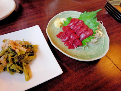 わさびの花のおひたしと大好きな馬刺し。( *´艸`)