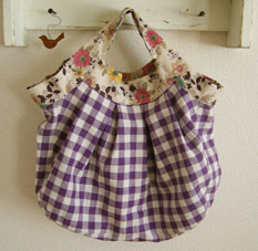 イニシャルテープを。内布は小さな鳥柄の生地です。内ポケット・あき口スナップボタンつき。