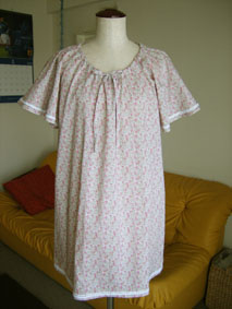 襟ぐりはゴム&共布ひも、袖口と裾にレースを縫い付けました。